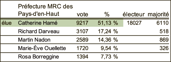 « C’est un grand honneur pour moi d’être la première femme à occuper le rôle de préfète de la MRC des Pays-d’en-Haut. Je ressens une profonde gratitude envers celles et ceux qui m’ont accordé leur confiance. Mes dix collègues membres du conseil et moi, avons l’occasion de travailler autrement, dans un esprit de collaboration, d’authenticité et d’amour pour ce magnifique territoire que nous partageons. Ensemble, nous souhaitons maintenir un conseil résolument tourné vers l’action » a mentionné Catherine Hamé.