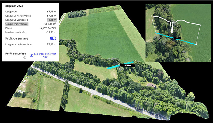 - Gestion environnementale – L’entreprise collabore avec des organismes de bassins versants pour réaliser des analyses détaillées des cours d’eau et des bandes riveraines. Les modèles tridimensionnels permettent de mesurer les distances, les surfaces et les pentes afin de faciliter la conformité réglementaire et de prévenir l’érosion. L’imagerie infrarouge peut aussi contribuer à repérer les milieux humides ou certains problèmes de drainage dans les champs nus au printemps.